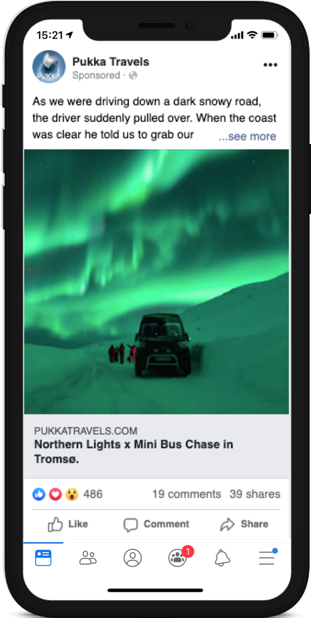The funnel consists of sending people to a blog post where they can read more about the Northern lights and where to see them, a few days after they are retargeted with other educational ads, such as when to see the NL and how to increase your chances of seeing it. The main goal of these ads is to build trust and awareness rather than sales. The audiences are pushed further down the funnel as they start exploring various tour offerings on Pukka Travel's website. At this point, they have shown buyer intent and are retargeted with more sales-focused ads.